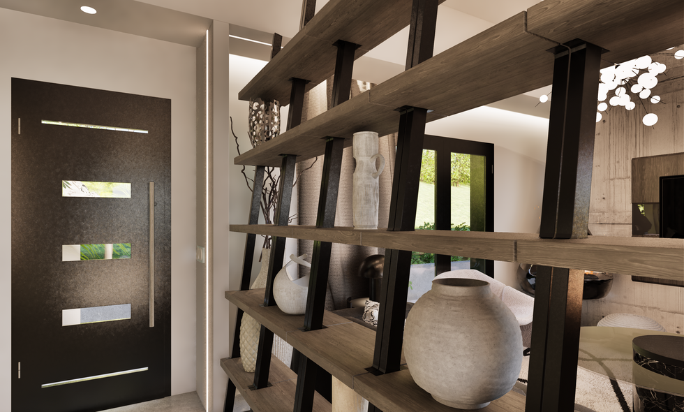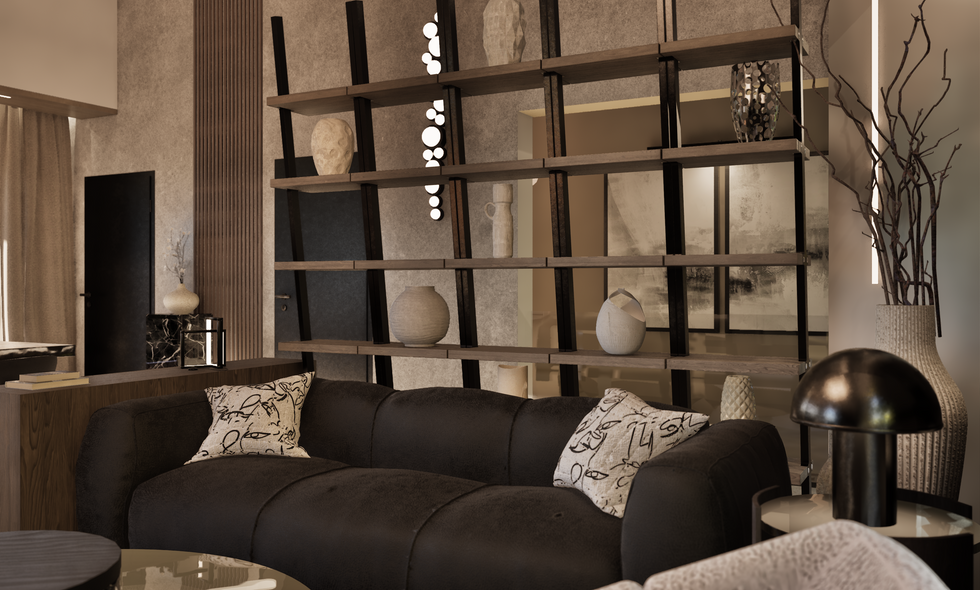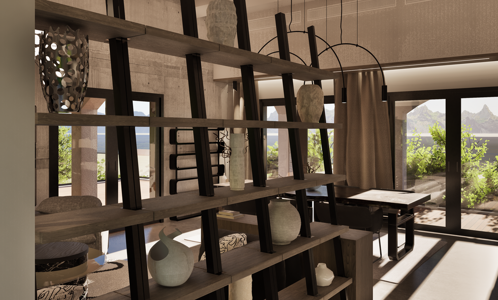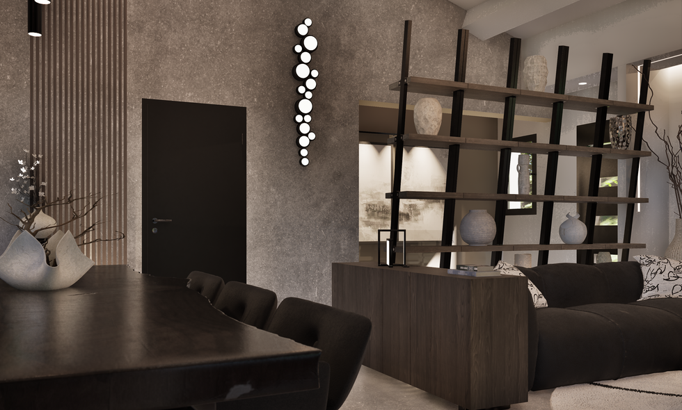 La bibliothèque constitue le geste fondateur du projet. Conçue comme une structure architecturale à part entière, elle dépasse sa fonction de rangement pour devenir un élément de transition. Sa composition, mêlant montants métalliques noirs et plateaux en bois, introduit un rythme régulier, presque graphique. Sa légère inclinaison vient rompre toute rigidité. Ce désaxement subtil crée une tension maîtrisée, qui dynamise la perception sans jamais déséquilibrer l’ensemble.