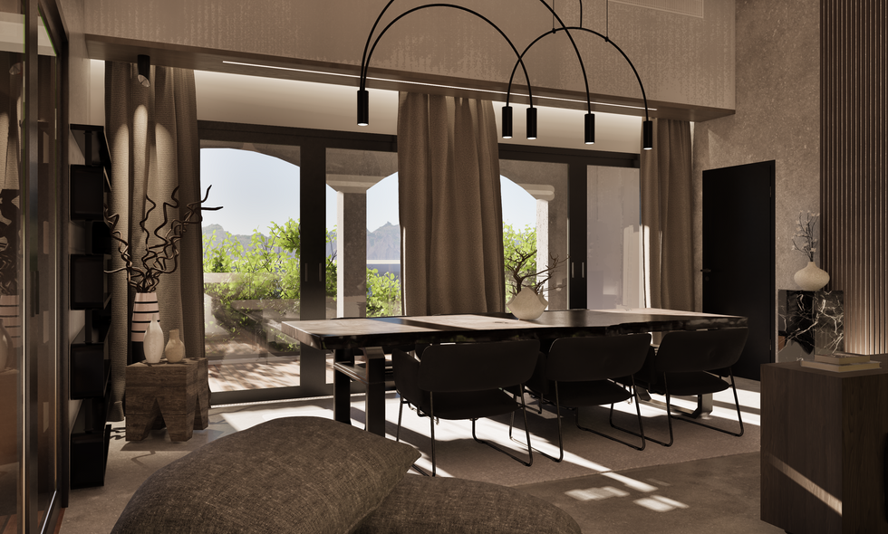 Au-dessus, la suspension se déploie comme un tracé dans l’espace. Composée de courbes métalliques et de points lumineux, elle accompagne la longueur de la table et en souligne l’axe. Elle ne surplombe pas l’espace, elle le structure. Les rideaux, dissimulés dans les caissons, prolongent verticalement les lignes du projet et filtrent la lumière naturelle sans la contraindre. L’extérieur reste présent, mais maîtrisé.Les équipements techniques — climatisation gainable et VMC — sont entièrement intégrés dans les volumes de plafond. Aucun élément parasite ne vient perturber la lecture, seules des grilles discrètes subsistent, dans une logique inspirée des codes hôteliers.