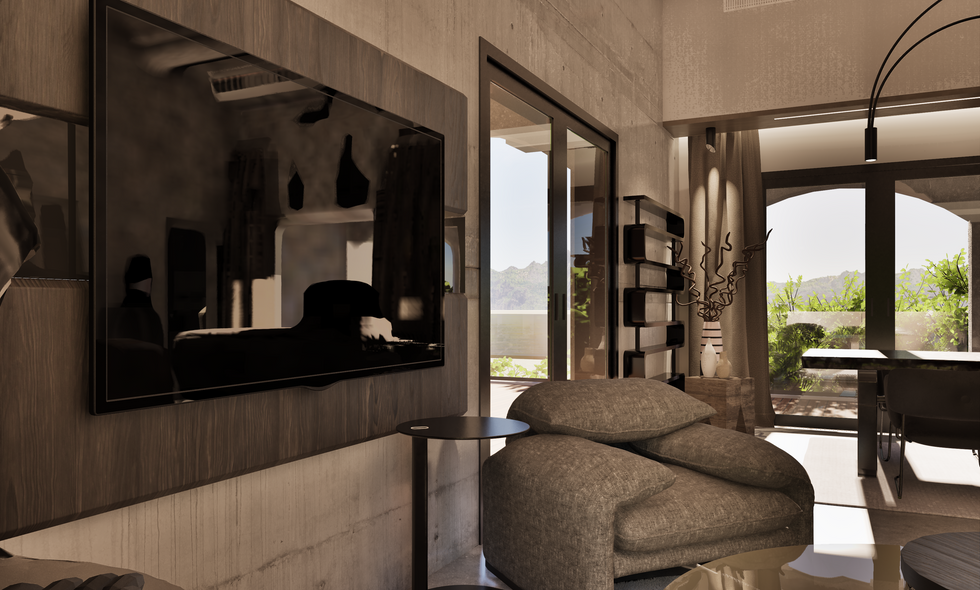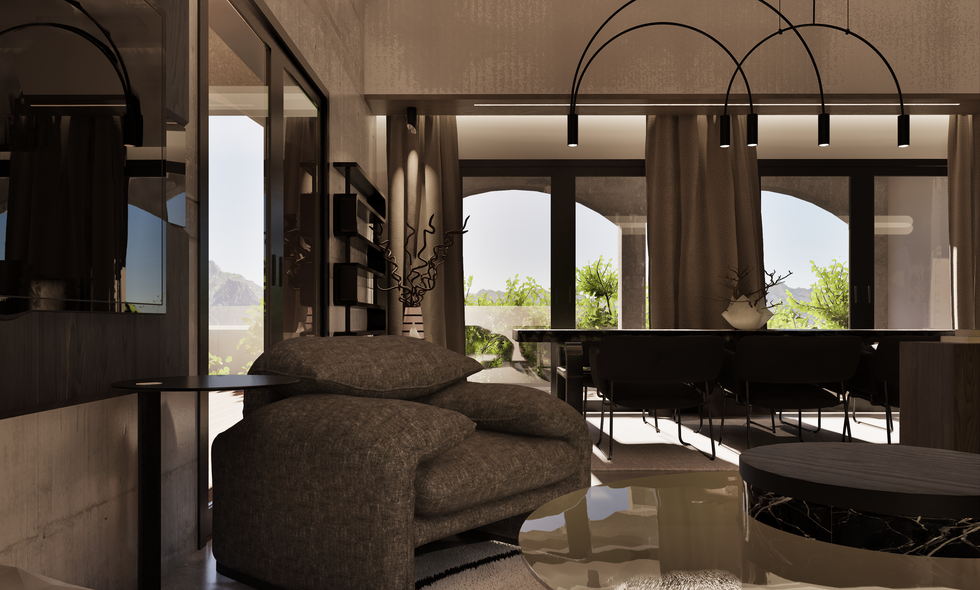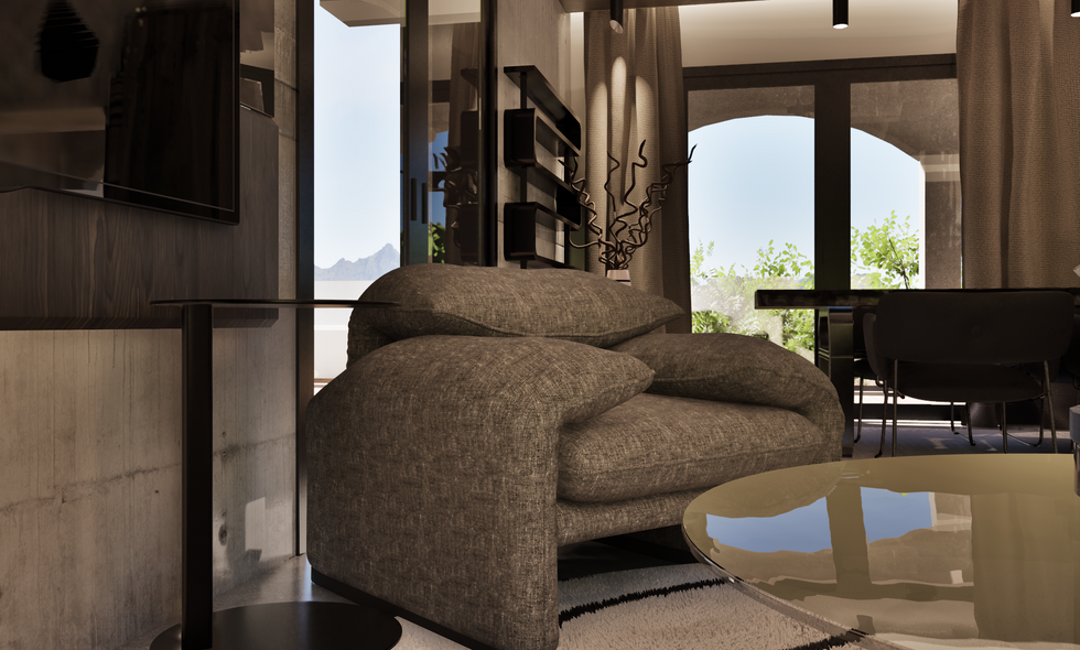 Le salon s’articule autour d’un équilibre entre radicalité minérale et confort maîtrisé.
